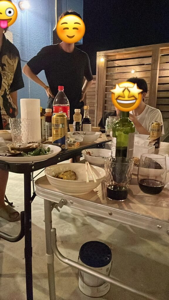 夜に仲間たちとバーベキューして酒飲んだり